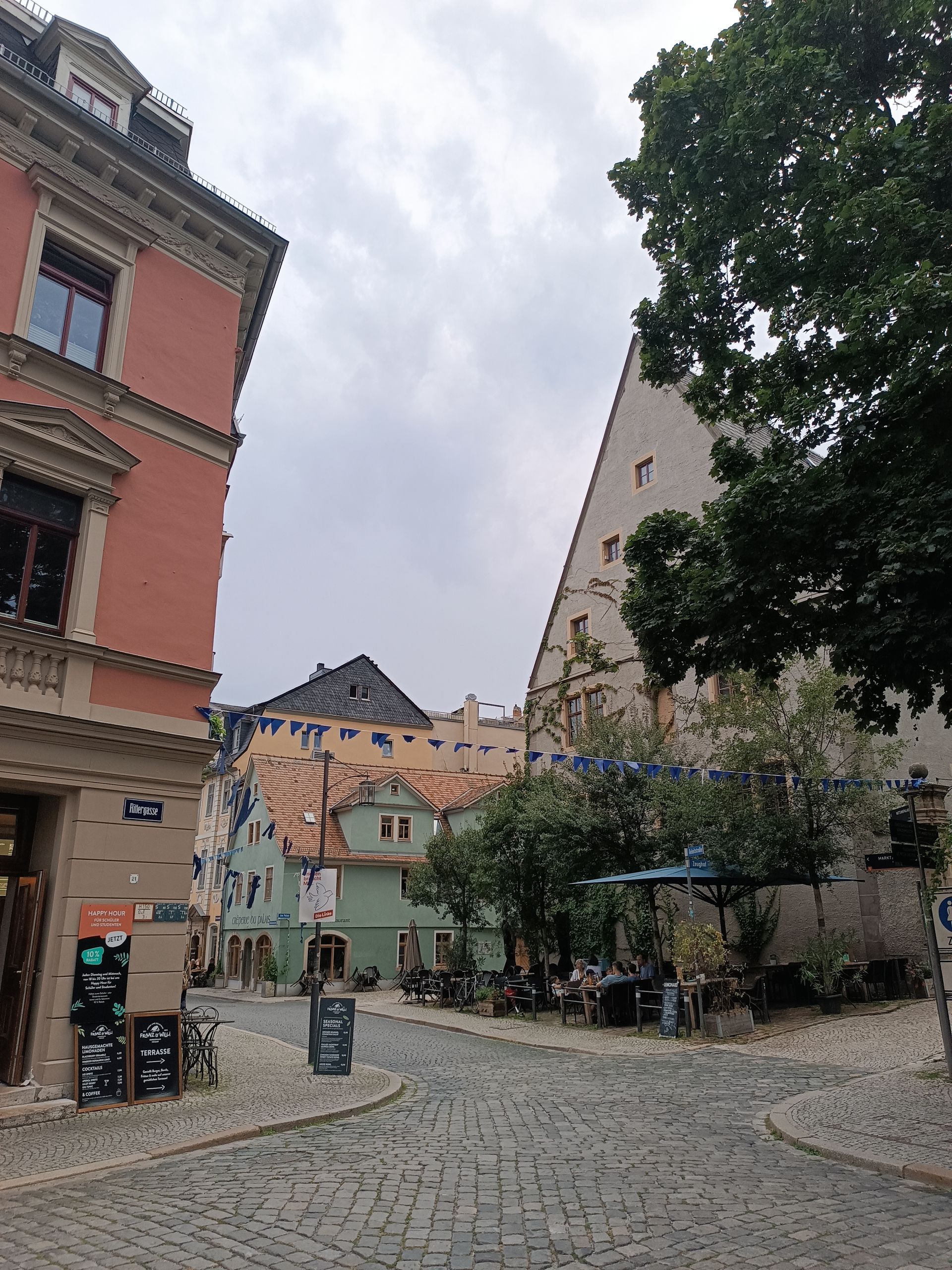 Nous arrivons au Sächsischer Hof. Nous fêtons notre venue avec un verre local et nous commandons une saucisse. Surprise… elle fait presque 50cm ! On mange donc un demi-mètre de cochon avec une purée de pomme de terre. Il est 19h et nous avons bien faim. Le plat arrivera à nous caler l’estomac.
