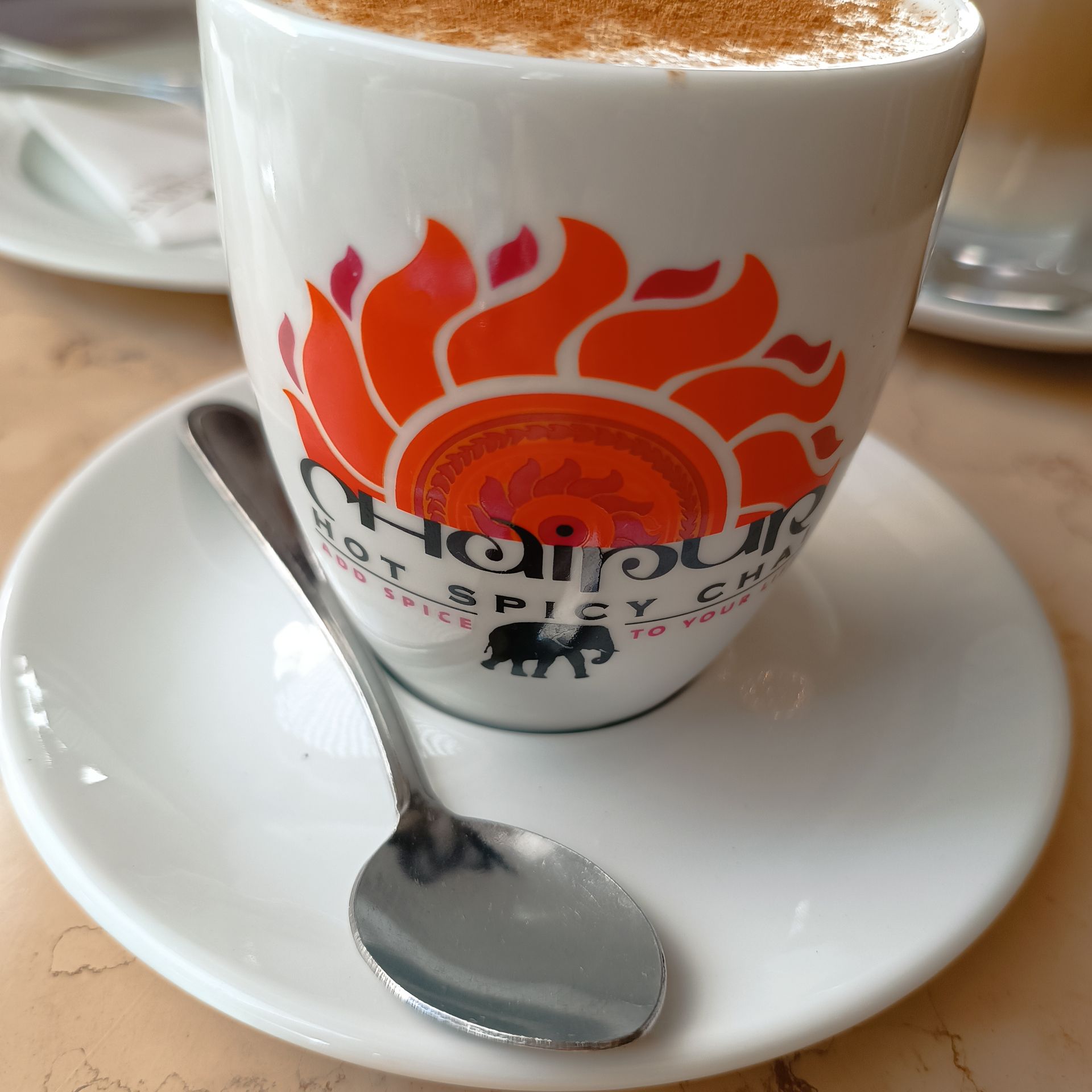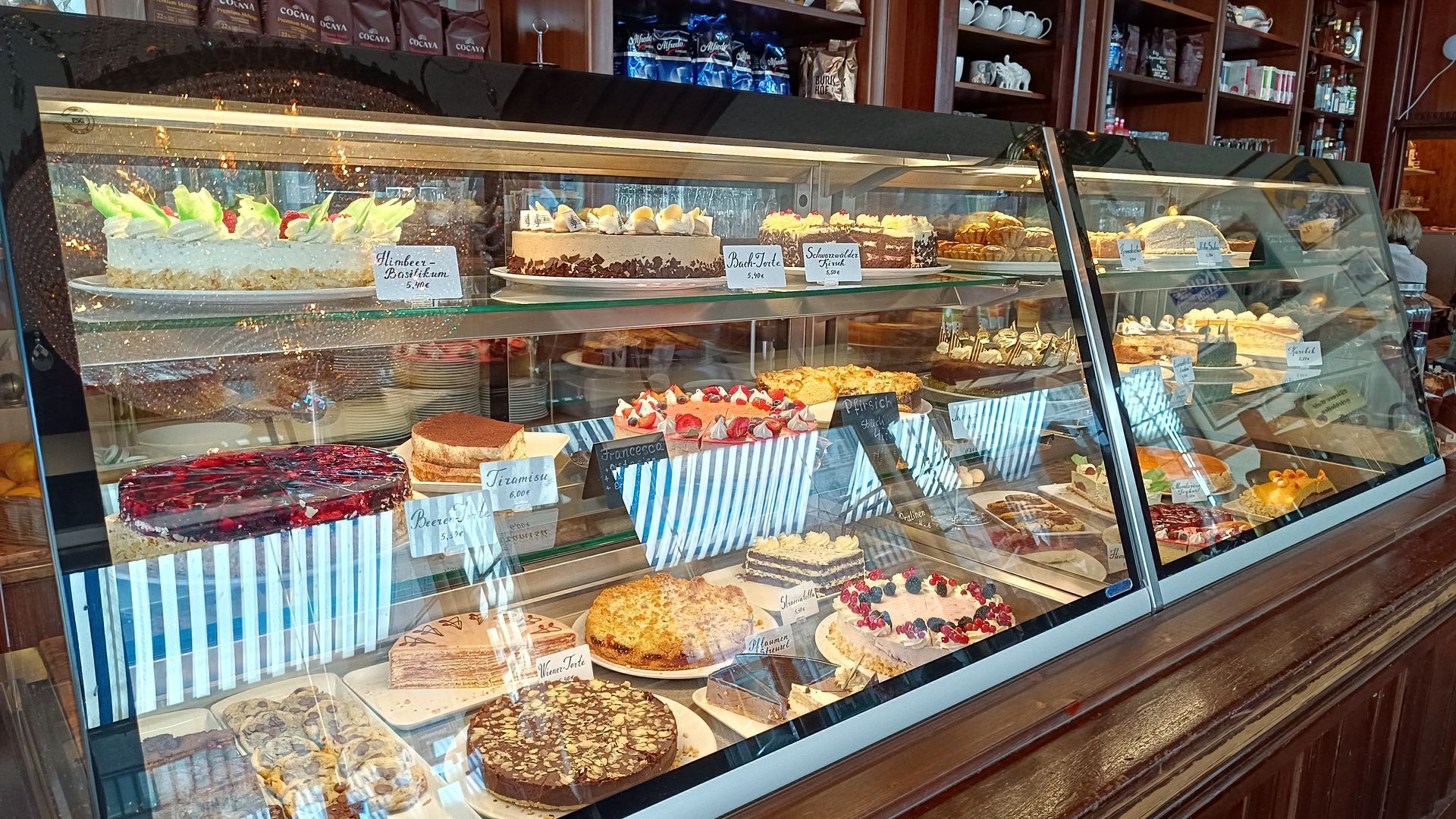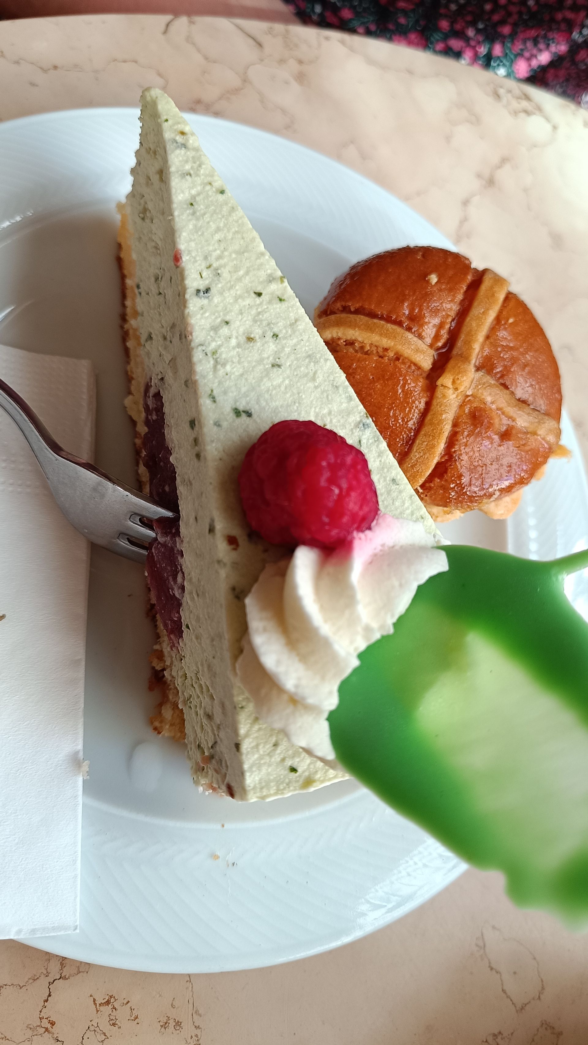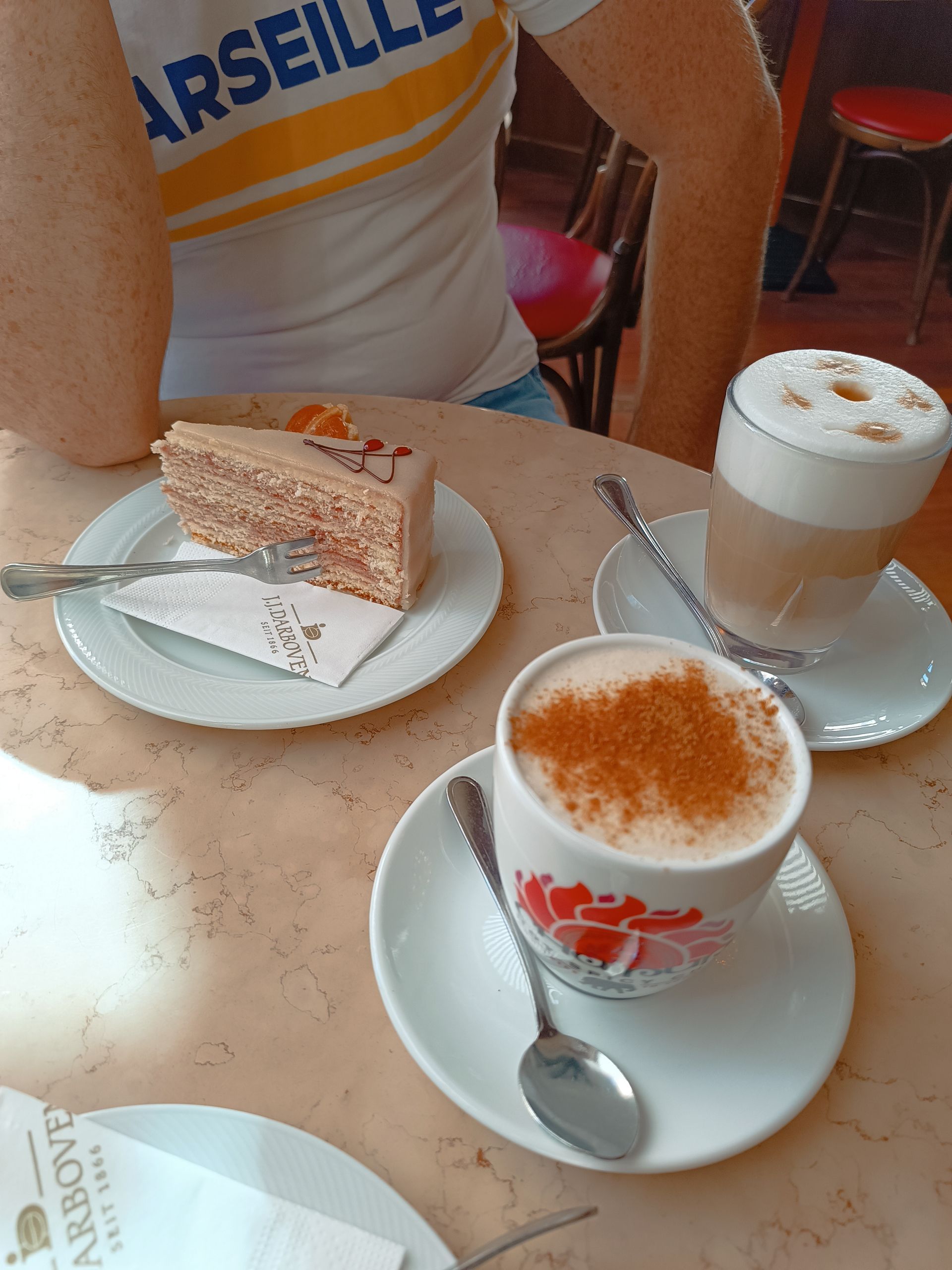 Nous nous installons à une table et nous passons commande. Cécile prend Chai latte et je prends un capuccino. Nous accompagnons cela d’une part de gâteau : Wiener Torte (à la fraise) pour Cécile et Himbeer Basilicum Torte (basilic cœur framboise) pour moi. Nous prenons aussi la spécialité de Leipzig :Leipziger Lerche (pâte sablée, frangipane et confiture).