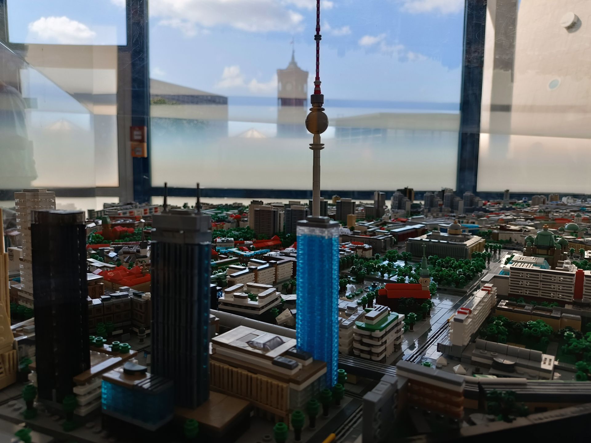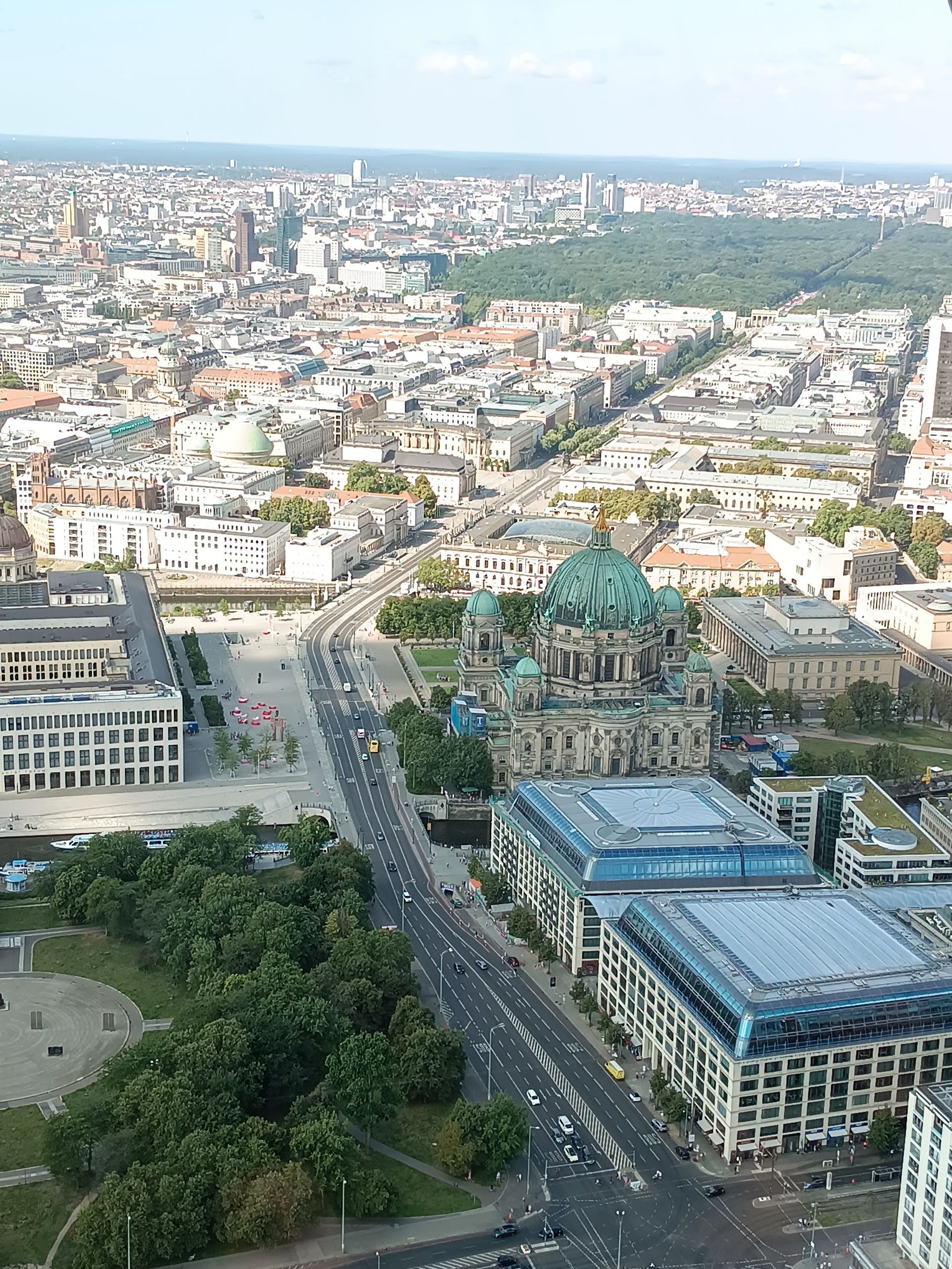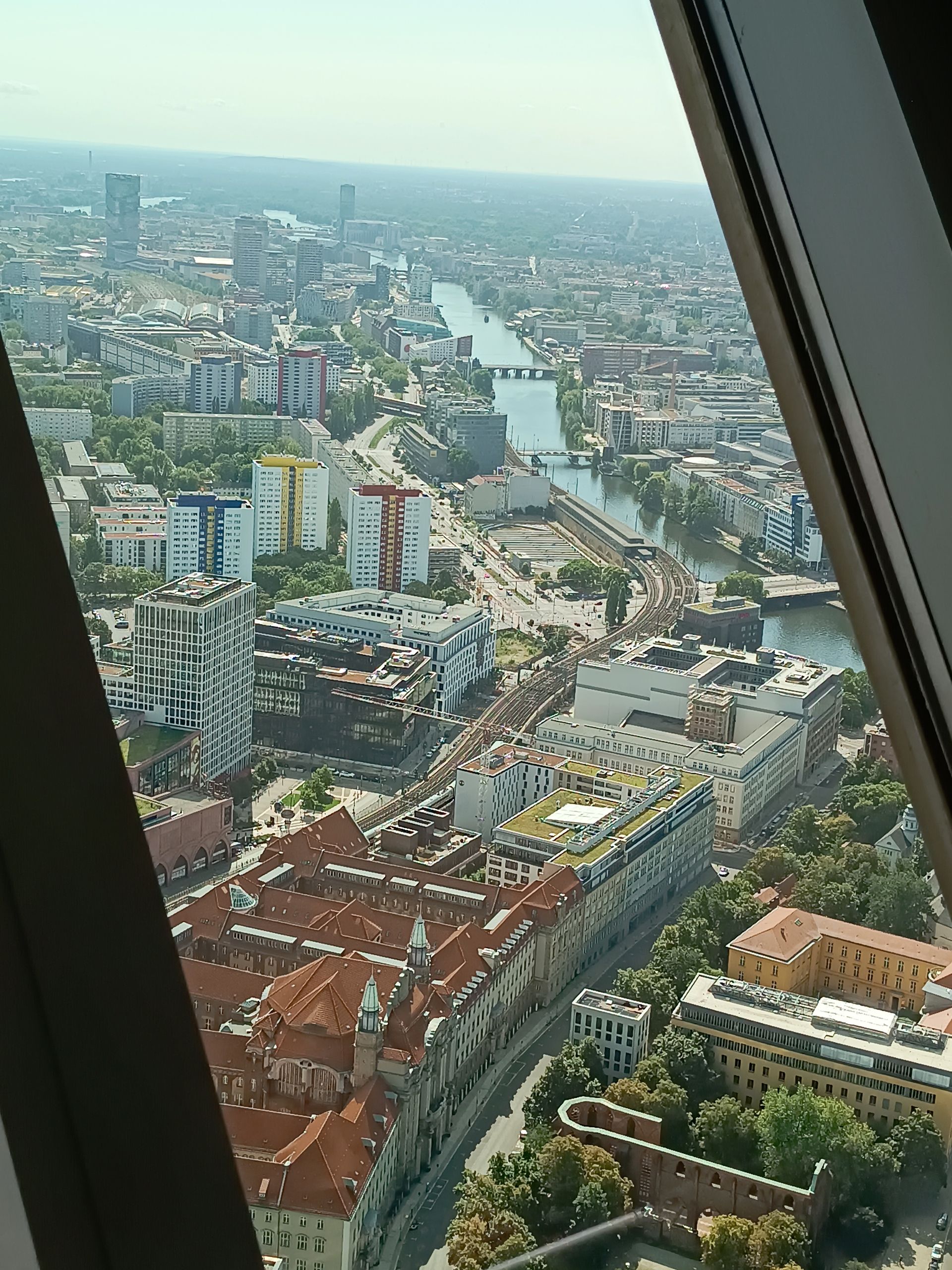 En arrivant, la vue est à couper le souffle. Nous voyons tout Berlin à 360°. Sous chaque fenêtre panoramique se trouve une photo avec les grands bâtiments et places de Berlin. Le temps est clair, le soleil est présent, la vue est incroyable. Nous faisons le tour 4 ou 5 fois en regardant les perspectives de la ville.