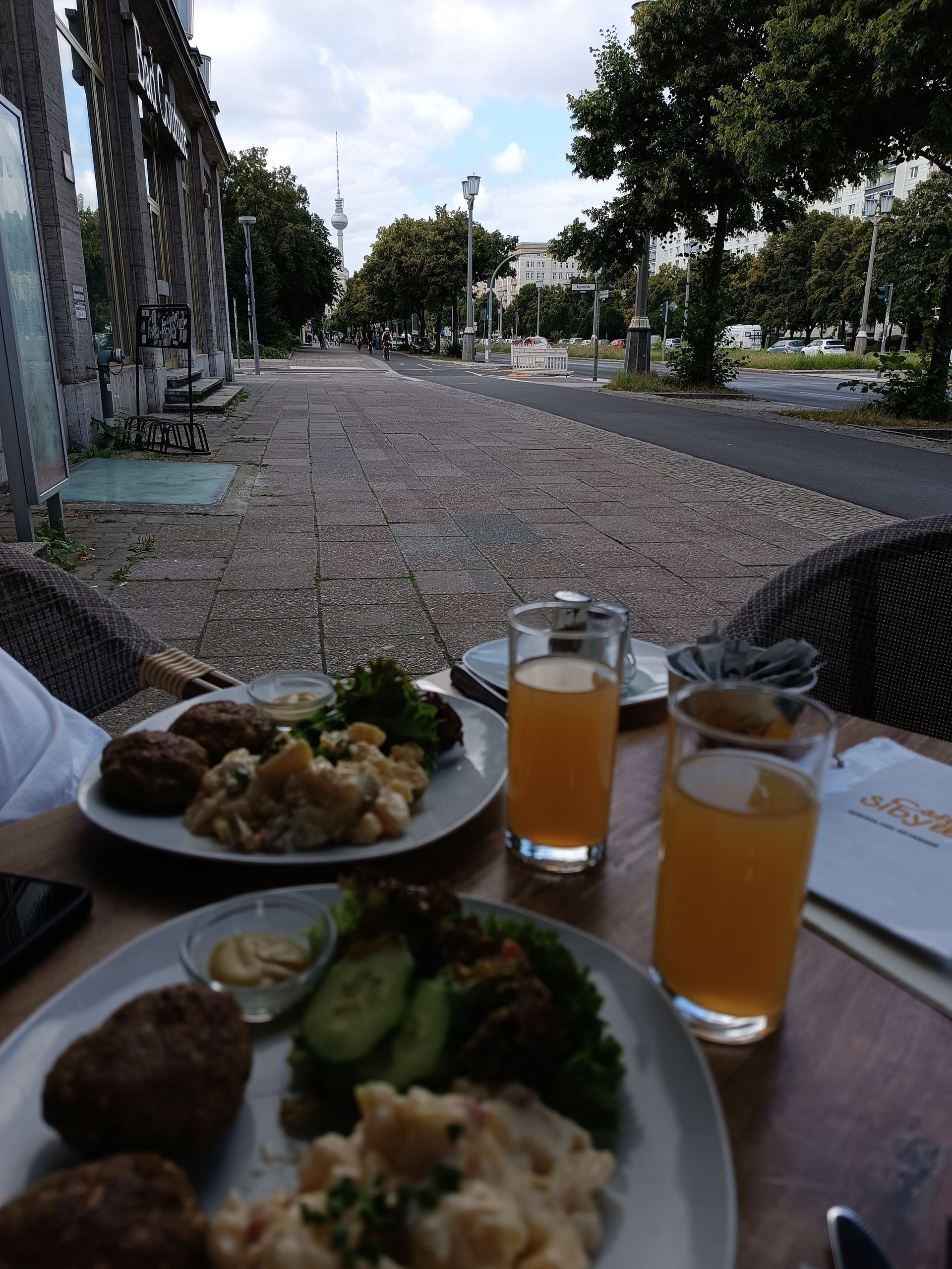 Il est l’heure de trouver un endroit pour se restaurer. Nous souhaitons aller au Café Sibylle. C’est un café « musée » sur le thème de l’Allemagne de L’Est. (Le thème de la journée). Nous y sommes déjà aller il y a quelques années pour boire un café et nous en avions un bon souvenir. Voulant rester dans le thème du jour, nous prenons le métro pour deux arrêts et nous arrivons sur la Karl Marx Allee. C’est soviétiquement époustouflant ! Tout est droit, clair, un peu austère et majestueux ! C’est le quartier où à été tourné le film : Goodbye Lenin. Très bon film au passage.