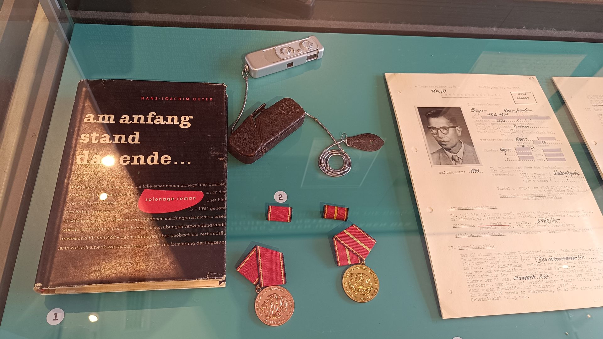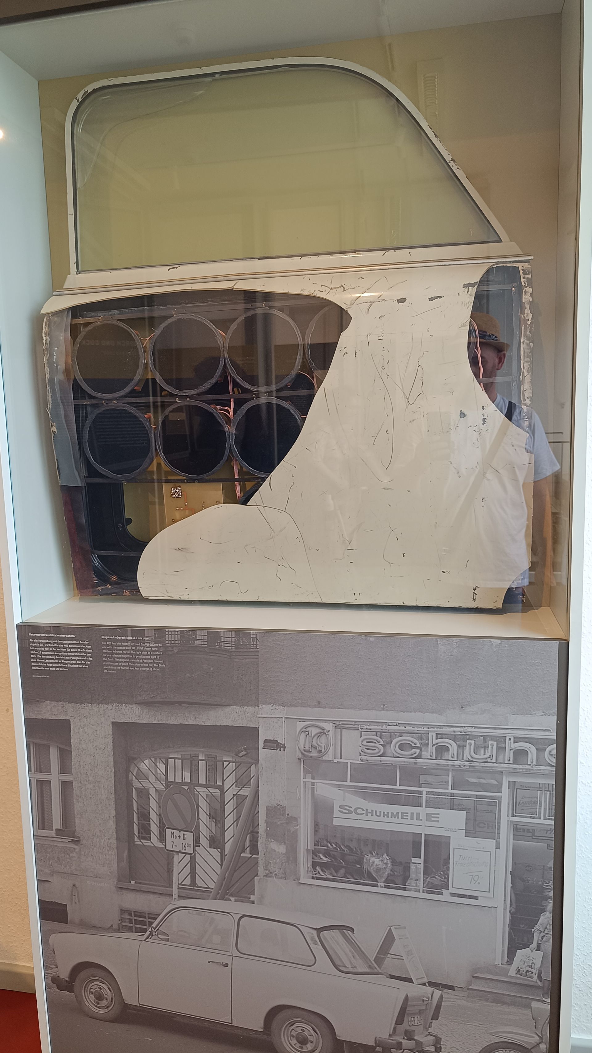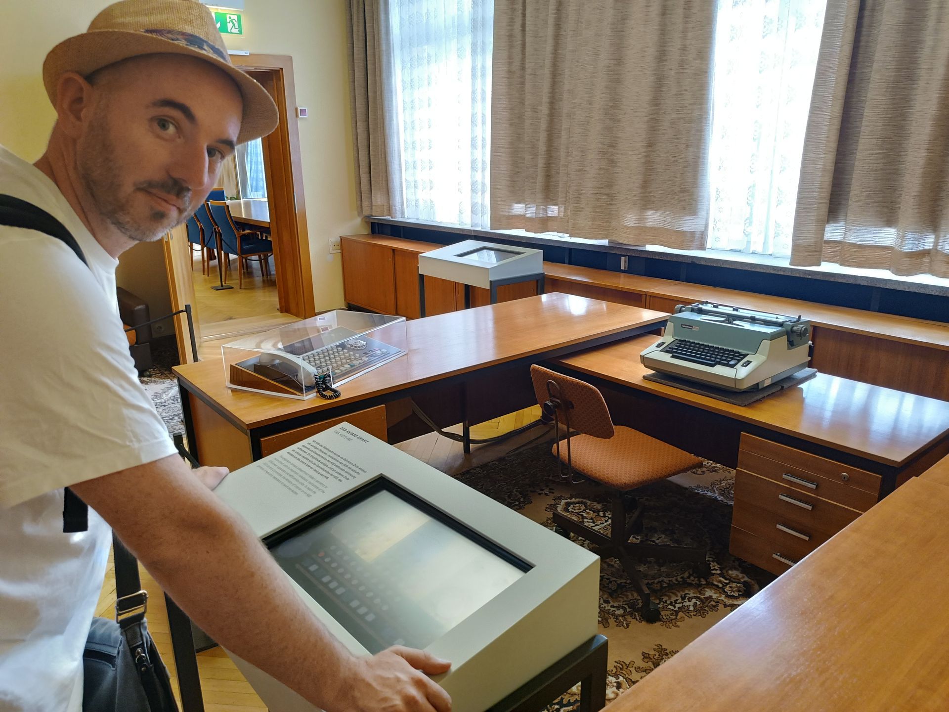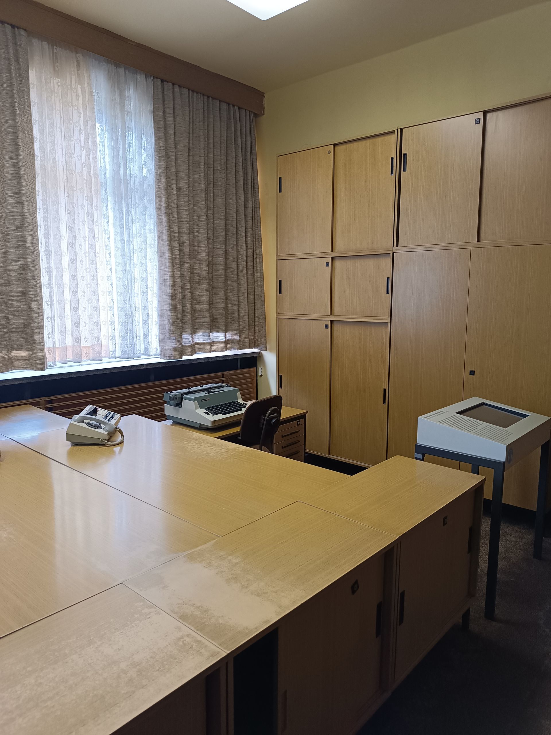 Nous finissons le 3ème étage et nous redescendons pour sortir. Nous avons chaud. Le bâtiment est dans son jus… il n’est pas très bien isolé… et il fait très chaud ! Nous prenons donc une bouteille d’eau au café du musée. Il doit s’agir du réfectoire de l’époque. Je demande donc en anglais 2 bouteilles d’eau et le vieux monsieur (75 ou 80 ans) me répète en allemand ce que je viens de dire en anglais me faisant comprendre par la même occasion avec le ton de sa reprise que je pourrais quand même faire l’effort de parler allemand. (C’est vrai… parler anglais c’est trop simple…) Mi amusé, mi interrogatif, je vais m’assoir et je demande à Cécile si elle a bien compris la scène comme moi. Il semblerait que oui. Se pose la question de ce vieux monsieur. Qui est-il ? Pourquoi travailler ici ? Vu son âge, il devait en avoir 30 ans en 1989. Un ancien espion ? un gratte papier administratif ? Toutes ses questions, sans réponses, participent au climat et l’ambiance du lieu. Rafraichis, nous repartons pour la suite des visites.