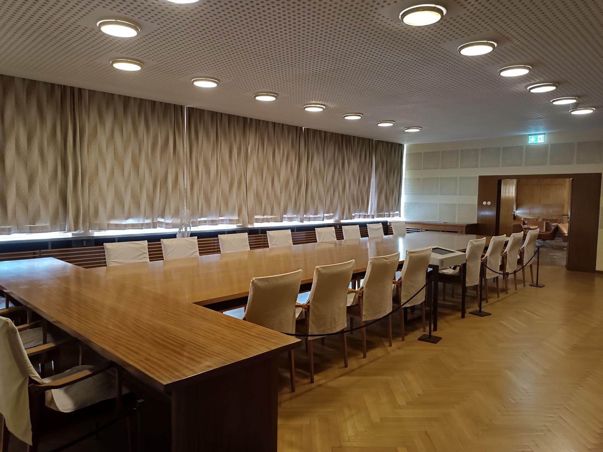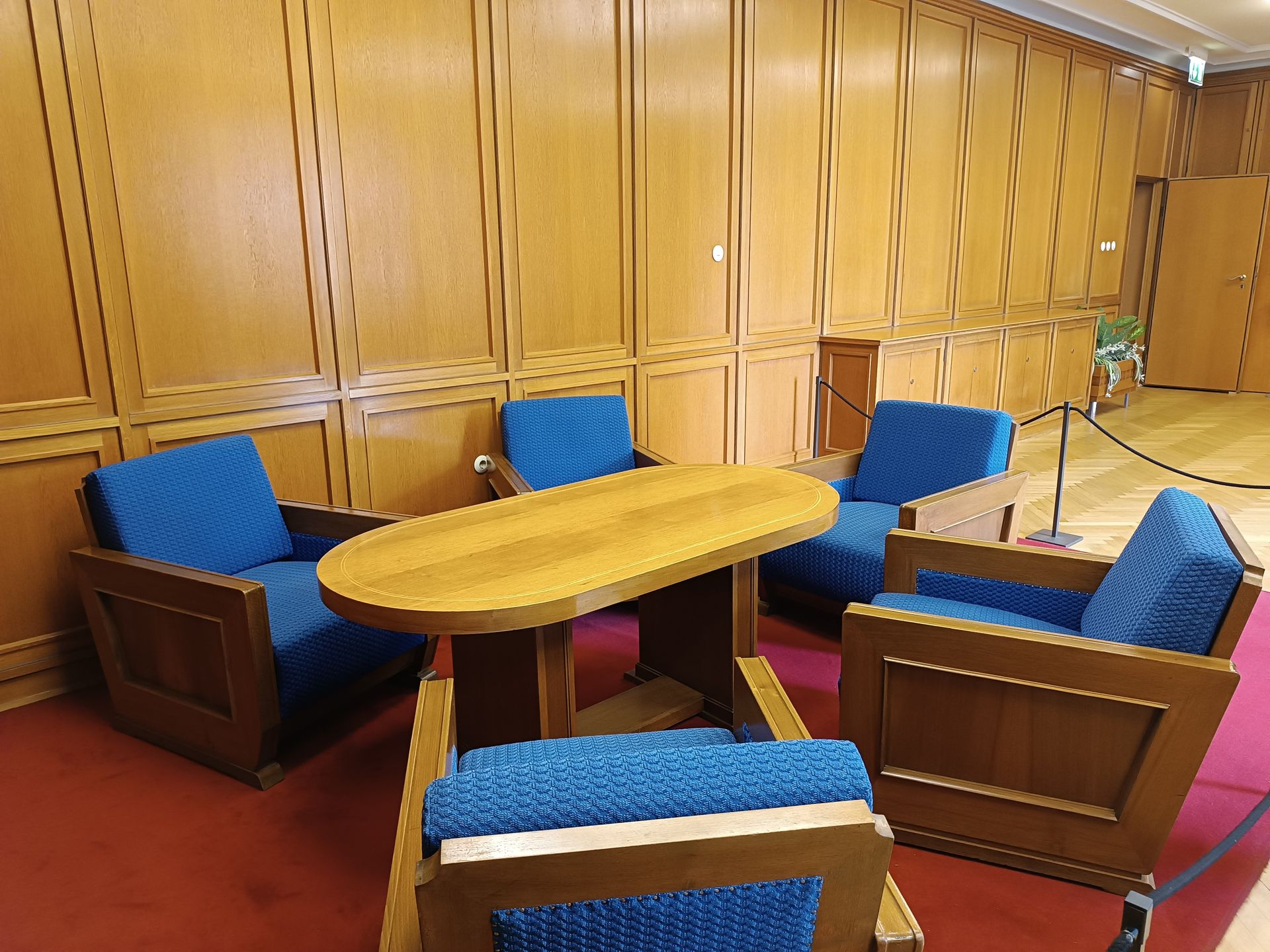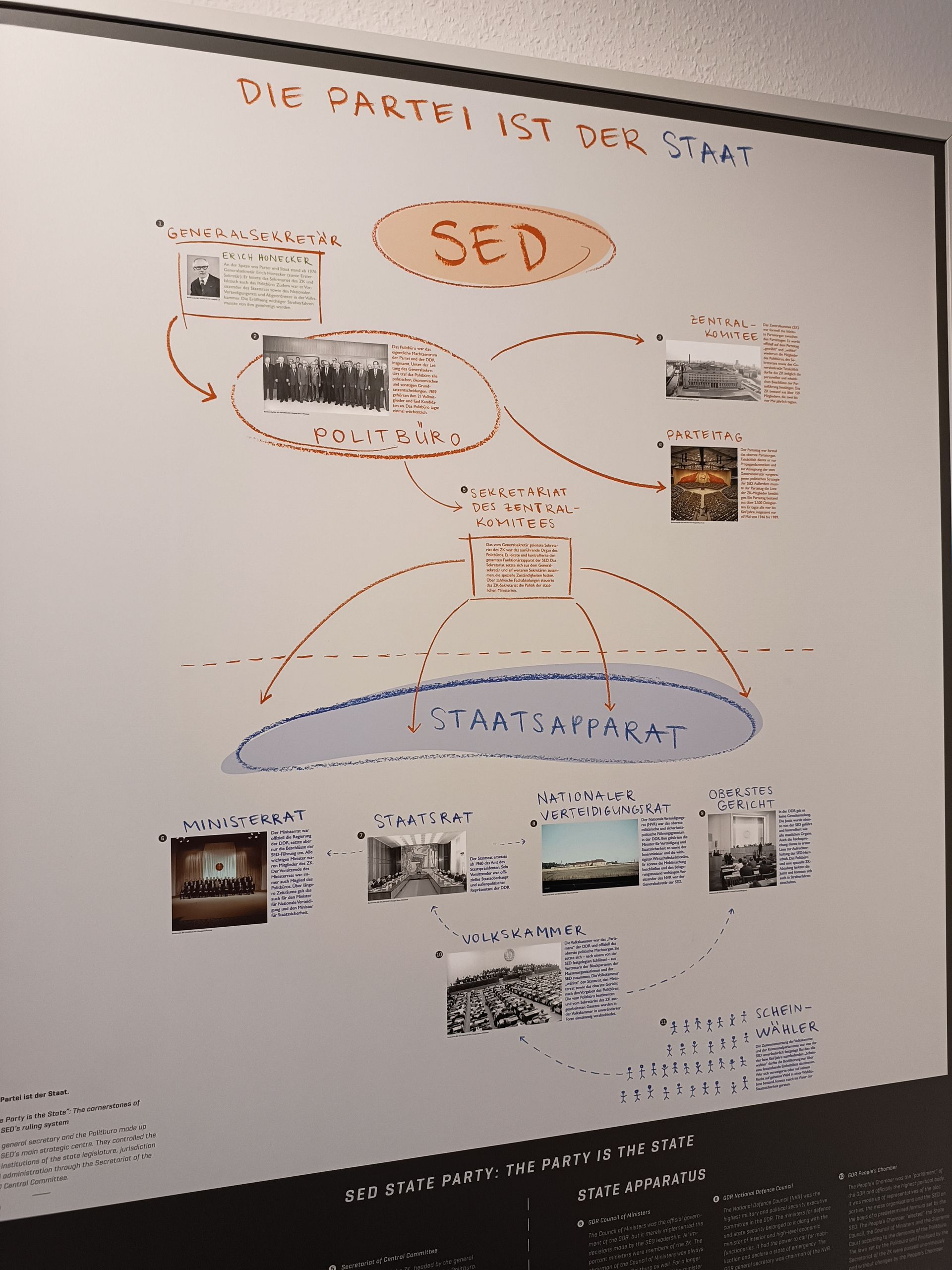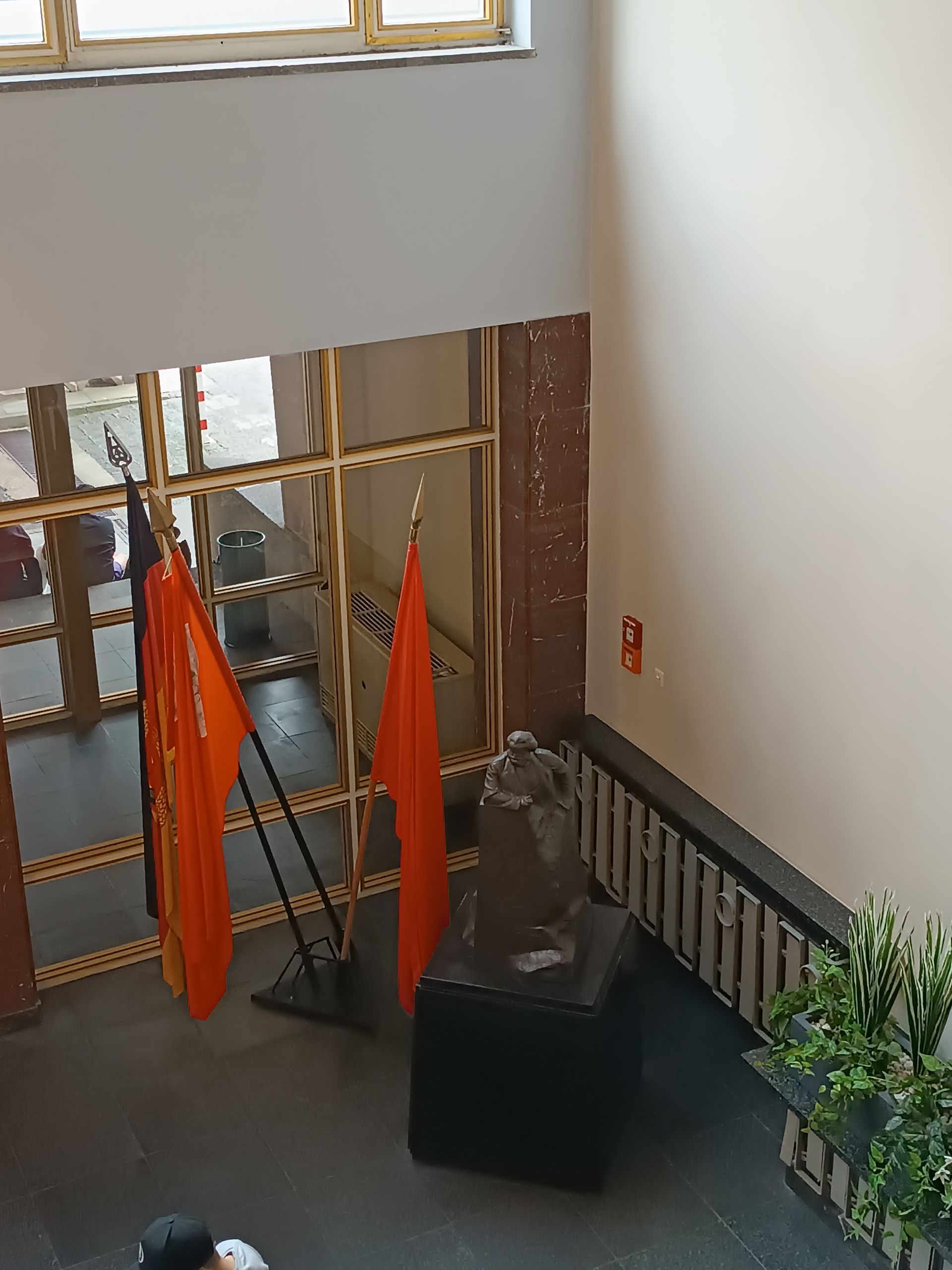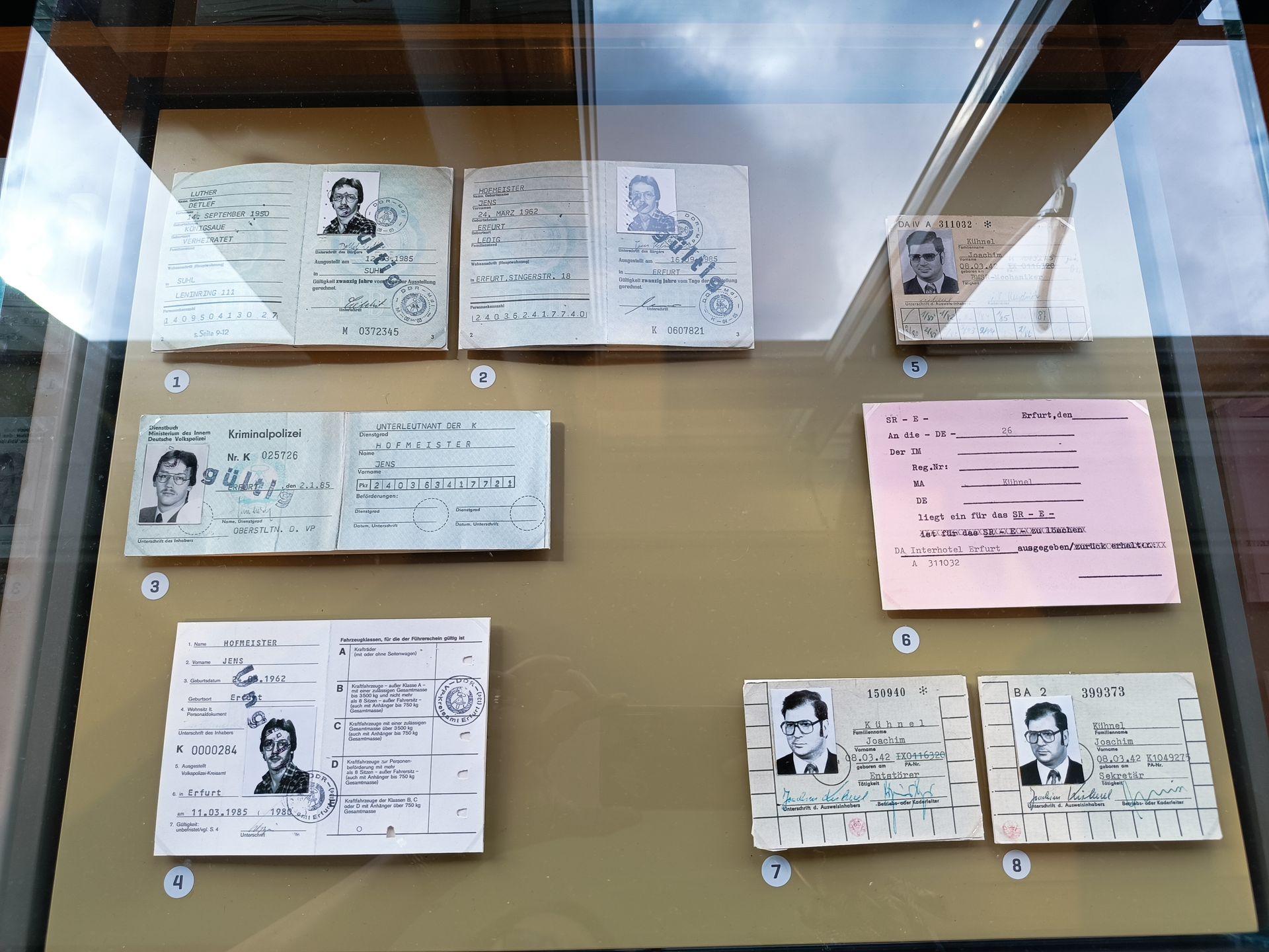 Nous finissons le 3ème étage et nous redescendons pour sortir. Nous avons chaud. Le bâtiment est dans son jus… il n’est pas très bien isolé… et il fait très chaud ! Nous prenons donc une bouteille d’eau au café du musée. Il doit s’agir du réfectoire de l’époque. Je demande donc en anglais 2 bouteilles d’eau et le vieux monsieur (75 ou 80 ans) me répète en allemand ce que je viens de dire en anglais me faisant comprendre par la même occasion avec le ton de sa reprise que je pourrais quand même faire l’effort de parler allemand. (C’est vrai… parler anglais c’est trop simple…) Mi amusé, mi interrogatif, je vais m’assoir et je demande à Cécile si elle a bien compris la scène comme moi. Il semblerait que oui. Se pose la question de ce vieux monsieur. Qui est-il ? Pourquoi travailler ici ? Vu son âge, il devait en avoir 30 ans en 1989. Un ancien espion ? un gratte papier administratif ? Toutes ses questions, sans réponses, participent au climat et l’ambiance du lieu. Rafraichis, nous repartons pour la suite des visites.