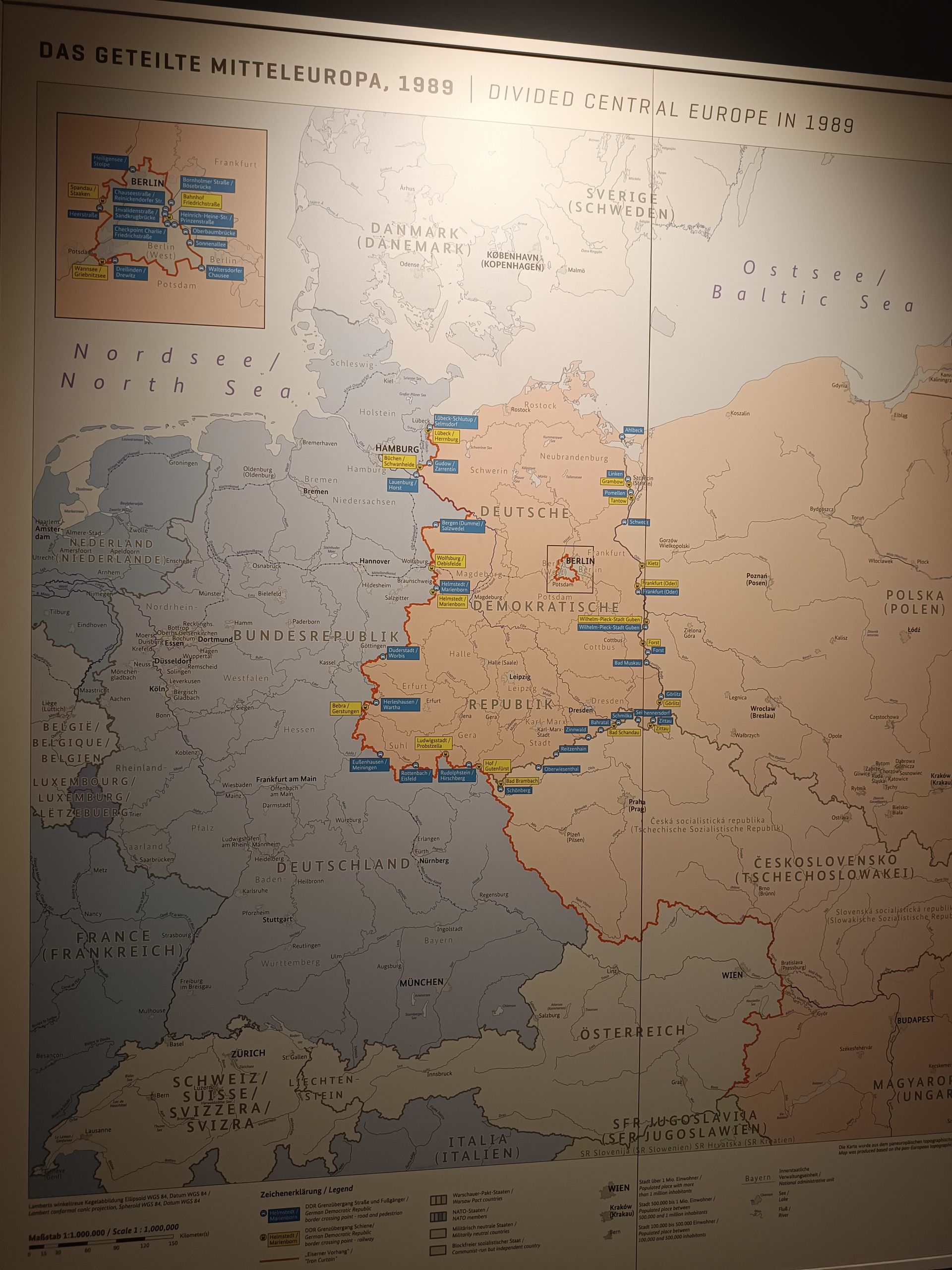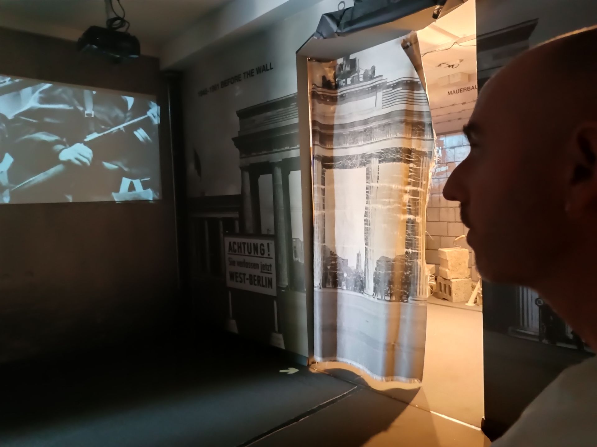 Nous commençons avec le musée du mur East Side Gallerie. Il y a un bâtiment juste derrière le mur. Nous montons au 2nd pour voir le musée. C’est étrange. On sent que cela a été fait par un passionné et un bricoleur. Beaucoup d’écrans (un peu de guingois), beaucoup de films d’archives inconnus (mais trop peu de sources). Les décors sont faits maison… bref… intéressant mais un peu bancal.